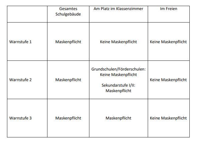 - Wird in einem Landkreis oder einer kreisfreien Stadt an drei aufeinander folgenden Tagen die Warnstufe 1 erreicht, so gilt ab dem übernächsten Tag die Maskenpflicht für alle Personen im gesamten Schulgebäude, bis der Platz im Klassenraum, im Lehrerzimmer oder im Büro erreicht ist. Während des Unterrichts am Platz und im Freien besteht keine